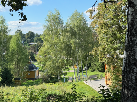 Дом видовой, место одно из лучших в данной локации, из окон и с участка открываются прекрасные пейзажи на святой источник и берёзовую рощу, настоящая шикарная русская природа, место силы (см. фото).
